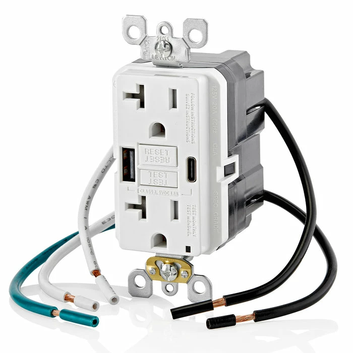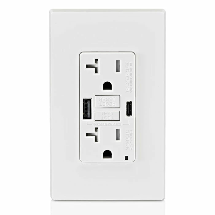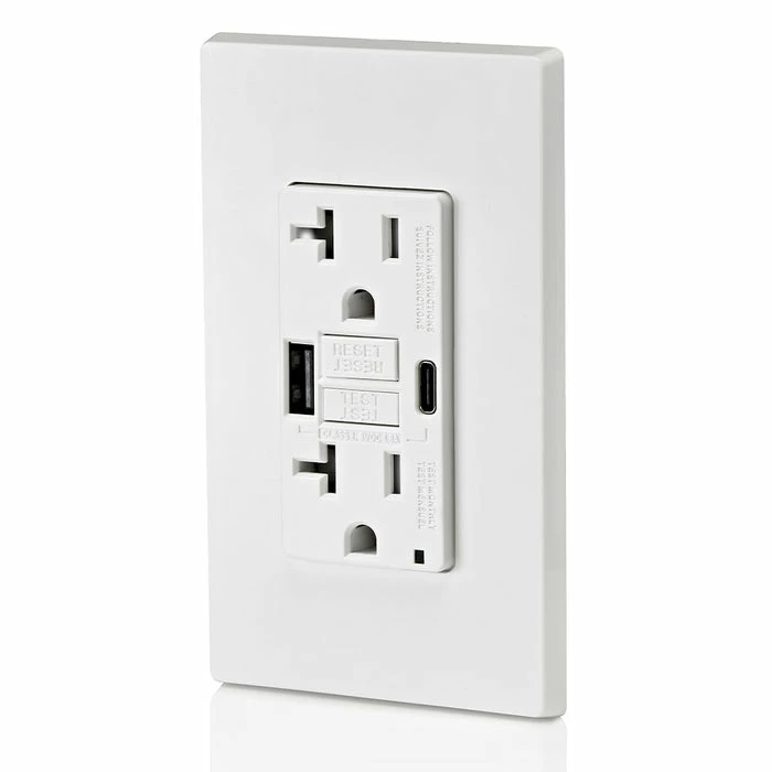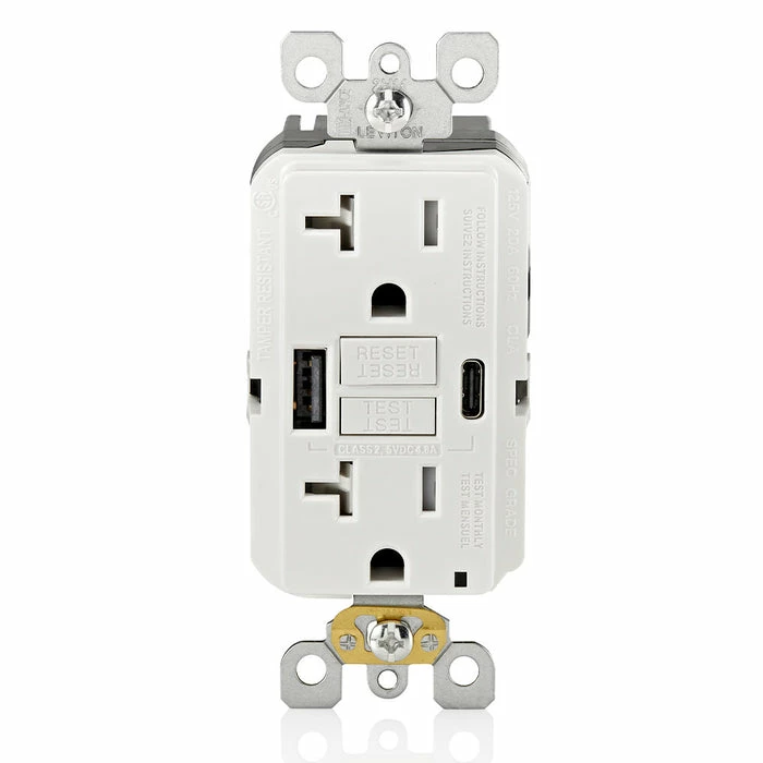 Leviton 20A GFCI Combination Receptacle With Type A/C USB Charger In White, Model GUAC2-W*
