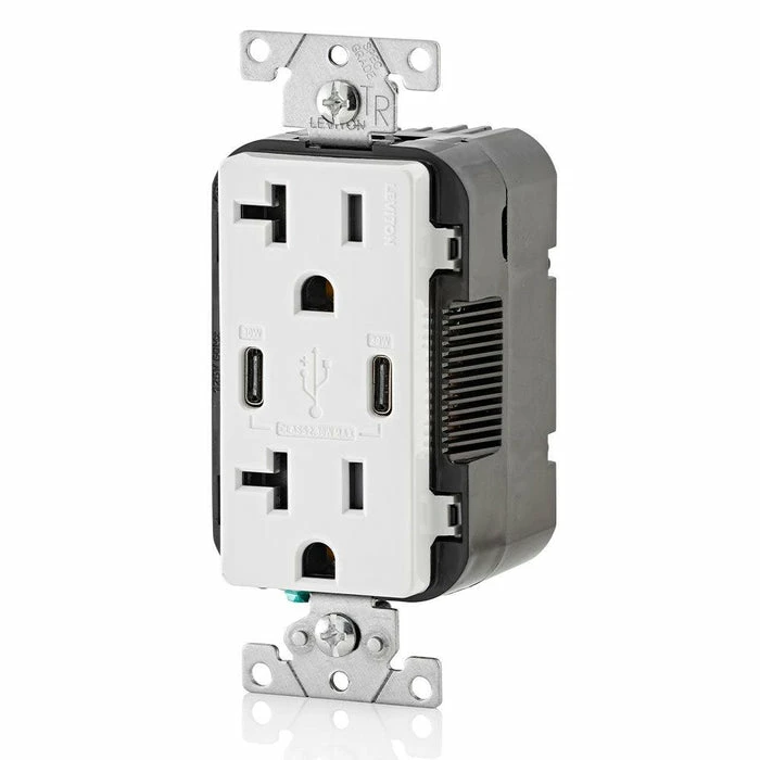 Leviton Dual Type-C USB Charger With 20A Tamper-Resistant Receptacle, White, Model T5835-W
