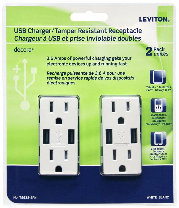 Leviton Package Of 2 Dual USB Type A Charger With 15A Tamper-Resistant Receptacle, Model T5632-754
