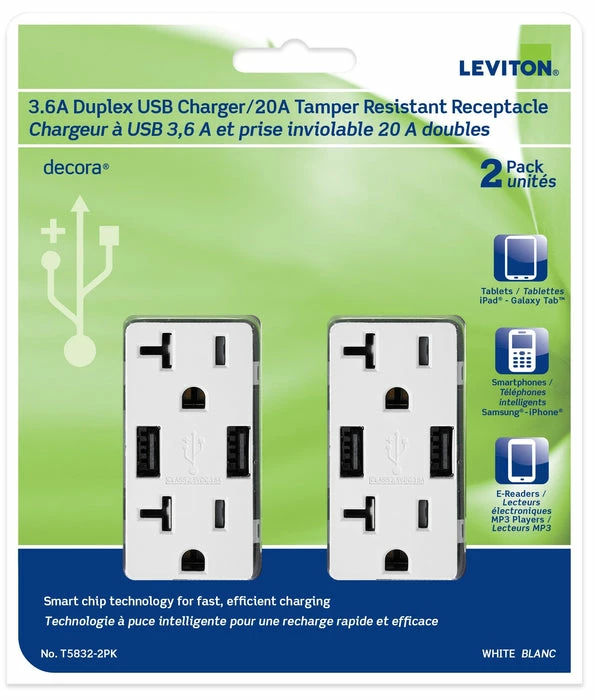 Leviton Package Of 2 Dual USB Type A Charger With 20A Tamper-Resistant Receptacle, White, Model T5832-754