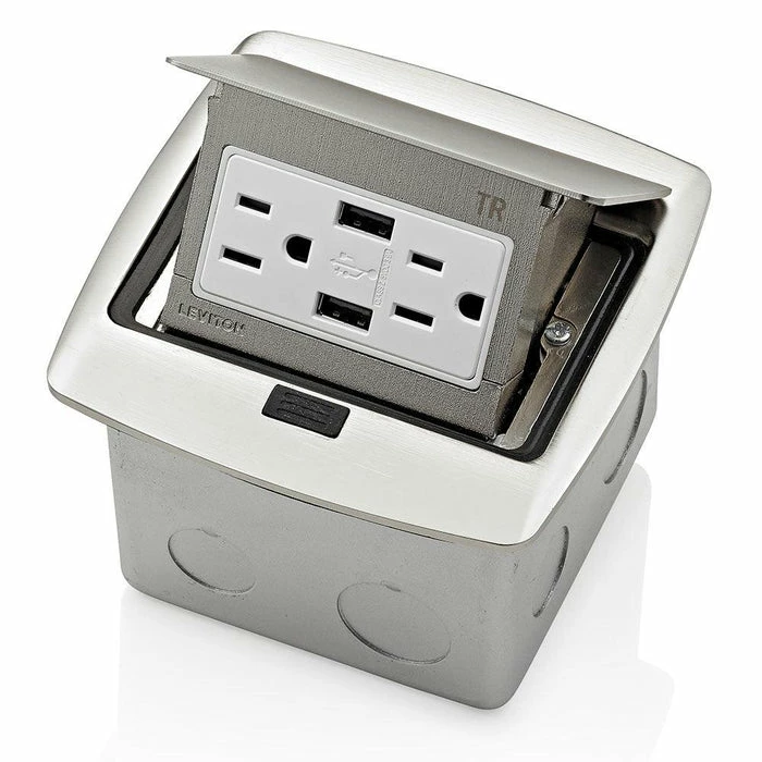 Leviton Pop-Up Floor Box Receptacle With Combo Dual Type A USB Charger & Outlet (Brushed Nickel) Model PFUS1-002